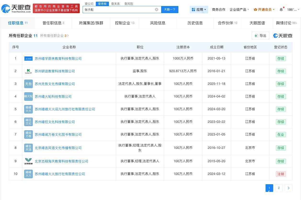 天眼查App显示,张雪峰(张子彪)名下关联11家企业,其中9家企业处于存续状态,包括苏州峰学蔚来教育科技有限公司、苏州研途教育科技有限公司、北京峰言风语文化传播有限公司等,张子彪在上述企业担任执行董事、法定代表人等职务。年报信息显示,上述9家存续企业参保人数合计超1000人,张雪峰公司实行的“上四休三”工作制及超长假期福利也曾多次引发网友讨论。
